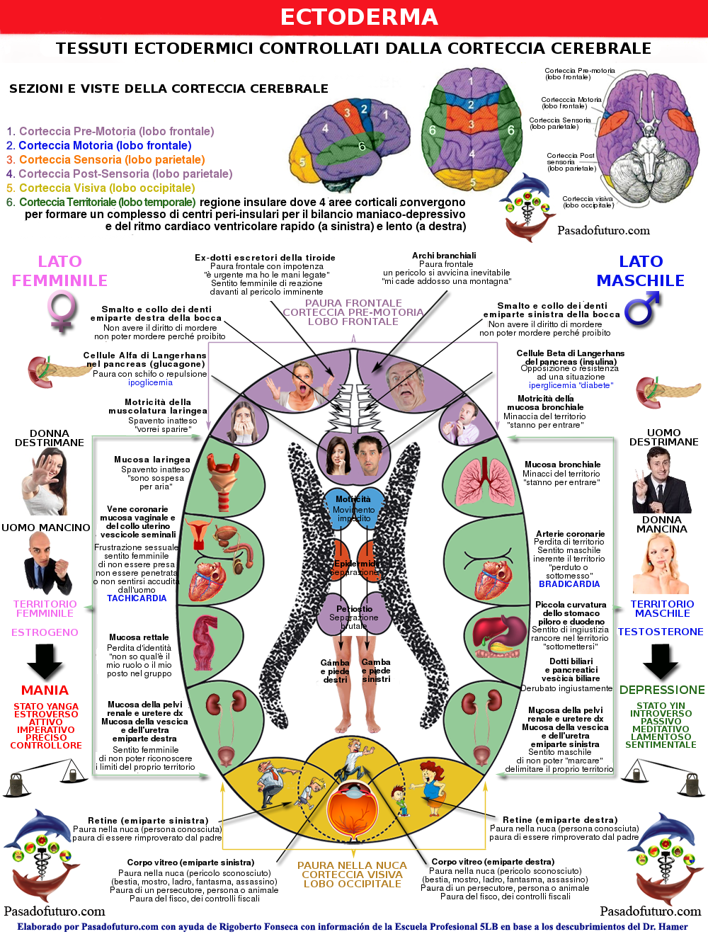 - Corteccia Sensoria Pre-Motoria (lobo frontale). Riceve conflitti di "paura frontale", "spavento frontale", blocco del movimento con spavento (paura a dirigersi verso una situazione pericolosa, paura costante al futuro, ciò che arriva o che è davanti). Conflitti di "sentirsi impotente, senza controllo". Legati alla mucosa dei dotti escretori della tiroide (ora atrofizzati) e all'epitelio squamoso della mucosa degli archi branchiali.