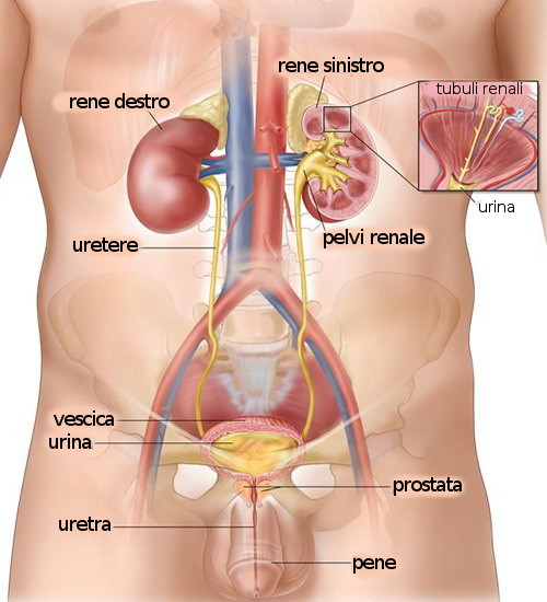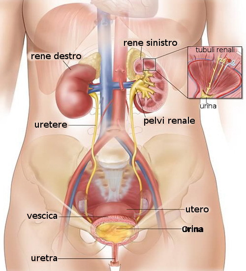 - Uretra: condotto escretore dell'urina che si estende dal collo della vescica fino al meato urinario esterno. Nella donna ha solo la funzione urinaria, misura circa 3.5 cm di lunghezza e si apre proprio sopra l'orifizio vaginale. Nell'uomo misura circa 15 cm. di lunghezza, passa attraverso la prostata e attraverso il pene, all'esterno del corpo; è un dotto comune all'apparato urinario ed a quello riproduttivo, portando all'esterno l'urina o il liquido seminale.