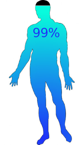 Se consideriamo la massa corporea, l'acqua rappresenta il 70% della massa intera, ma questo non è molto significativo. Ben più importante è il considerare la concentrazione molare delle molecole d'acqua nell'intero organismo e si scopre facilmente che le molecole d'acqua costituiscono il 99% dell'intero organismo.