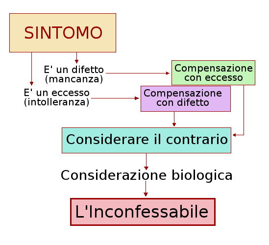 All'apparire di un sintomo consideriamolo in termini di: manca qualcosa (manca la sensibilità, o c'è un ulcera o manca la voce, o sono depresso, o altro) o c'è eccesso di qualcosa (un tumore, una ipertensione, un calcolo o altro). Successivamente pensiamo al contrario del sintomo: se manca qualcosa c'è stato un eccesso di qualcosa (la sensibilità diminuita può essere riferita ad un contatto indesiderato; se c'è un ulcera occorreva far spazio a qualcosa di ingombrante; se manca la voce il nemico è troppo vicino e non posso urlare; se sono depresso è perché la vita è troppo aggressiva e il nemico è troppo forte, ecc.). Se c'è una eccedenza di qualcosa è perché in realtà mi mancava qualcosa (un tumore riempie un vuoto funzionale o esegue il lavoro con più efficienza; se sono iperteso posso avere più energia e più vitalità; se c'è un calcolo mi mancava l'autocontrollo, ecc.)