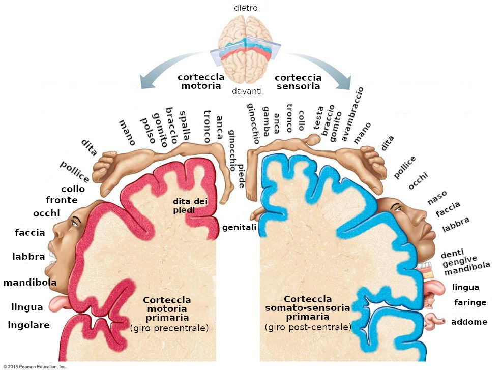 Dove si perdono questi contatti, a livello cerebrale? Lo potete vedere nella figura sottostante, dove è riportato il famoso Homunculus.