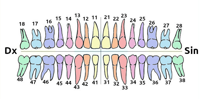 I denti si numerano dagli incisivi (al centro) verso i molari. Quindi il primo incisivo sarà il numero 1 , il secondo sarà il numero due, fino al numero 8 che è il dente del giudizio. Pertanto il primo incisivo del primo quadrante sarà il dente 11. Il dente del giudizio del primo quadrante sarà il numero 18. Il canino del secondo quadrante sarà il 23. Il primo numero indica il quadrante di appartenenza del dente, il secondo numero indica a che dente ci riferiamo.