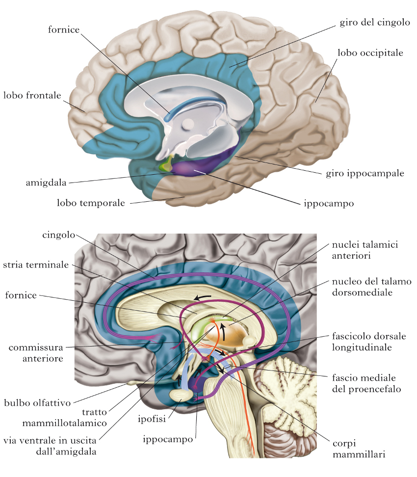 Il sistema limbico, chiamato anche cervello medio, si situa immediatamente sotto la corteccia cerebrale, comprende centri importanti come il talamo, ipotalamo, l'ippocampo, l'amigdala cerebrale.