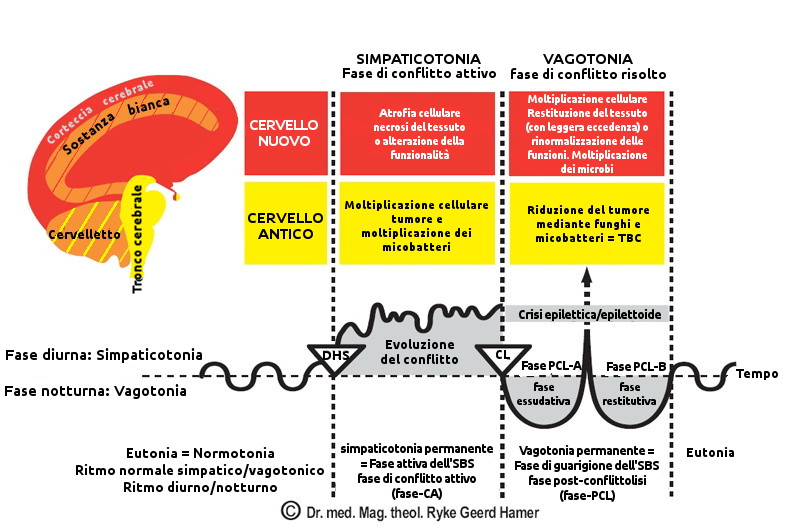 Il programma di malattia attivato (proliferazione cellulare, necrosi, ulcere o disfunzione) insiste perché il requisito psicobiologico non è stato soddisfatto. È inutile continuare a tagliare, irradiare o medicare senza tener conto che il soggetto malato deve entrare in una fase di normotonia, prodotto della soluzione o disattivazione del conflitto.