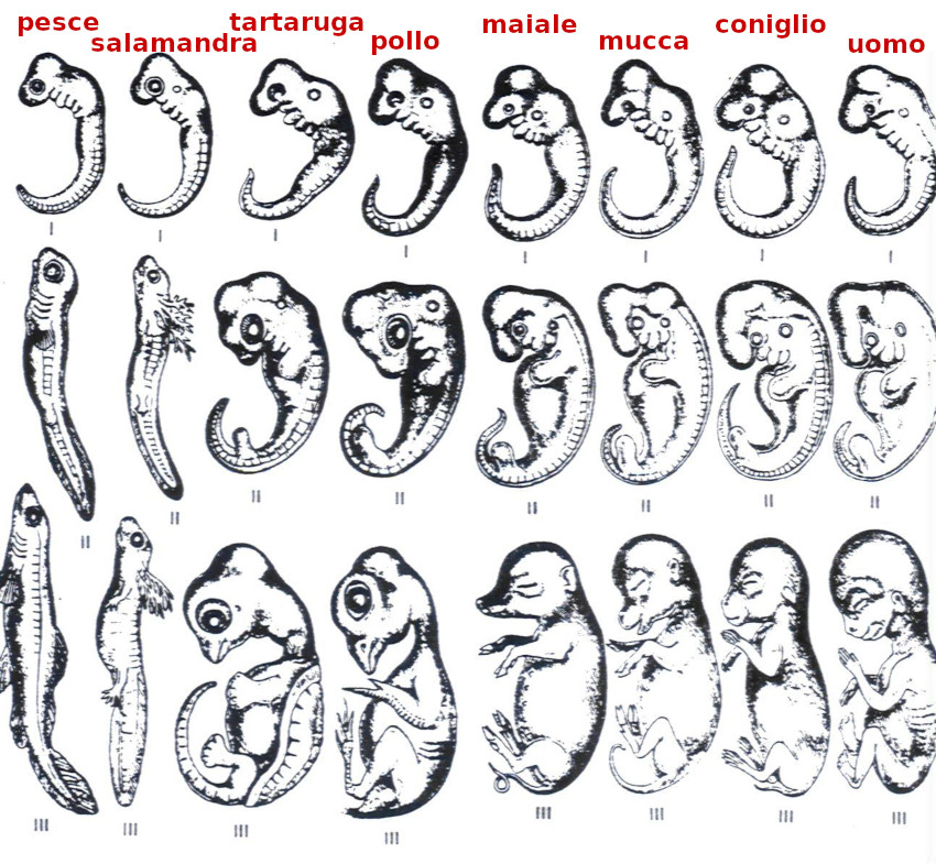 Tuttavia, non dobbiamo dimenticare la natura conservatrice dell'evoluzione. Un esempio è la permanenza dello stesso linguaggio genetico nel cervello dei vertebrati, anche quando il linguaggio genetico degli altri organi è stato differenziato. Possiamo dire che siamo tutti membri della stessa famiglia. La formazione di un embrione umano infatti ricorda l'evoluzione di tutti i vertebrati: pesci, anfibi, rettili, uccelli, mammiferi. Diciamo che l'ontogenesi è una riproduzione della filogenesi. L'essere ripete storie evolutive.