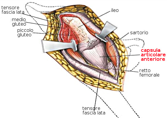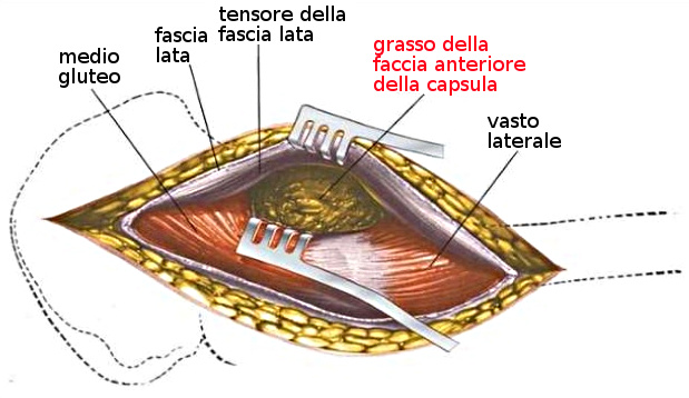 Per poter giungere all'articolazione, è necessario sezionare la fascia per un tratto più o meno lungo, in base al tipo di accesso. Per mantenere divaricata la fascia lata, viene applicato un divaricatore autostatico che esprime una grandissima compressione e trazione su questa struttura, aumentando l'intensità dell'aggressione. Se non viene applicato il divaricatore, è comunque necessario applicare delle leve che espongono l'articolazione, le quali esercitano trazioni e pressioni anche superiori.