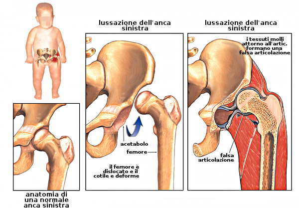 - displasia: condizione per la quale lo sviluppo dell'articolazione ha subito delle alterazioni per cui la testa del femore si trova in posizione diversa da quella normale e l'acetabolo ha una conformazione non in grado di accogliere la testa femorale.