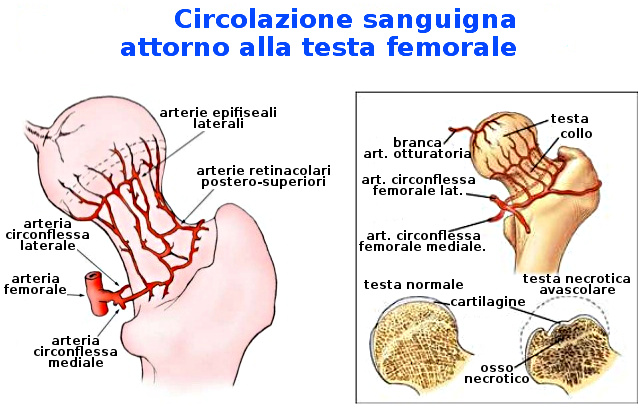- necrosi: condizione per la quale alcune aree della testa del femore si necrotizzano e si afflosciano determinando la perdita della struttura spongiosa e il supporto alla cartilagine articolare.