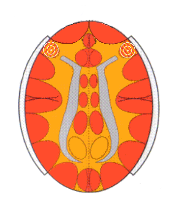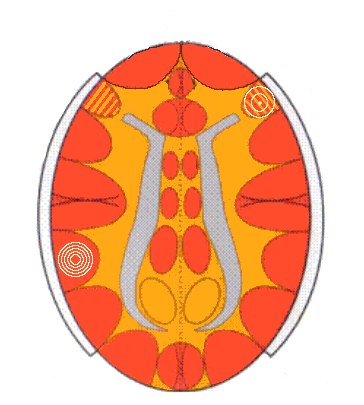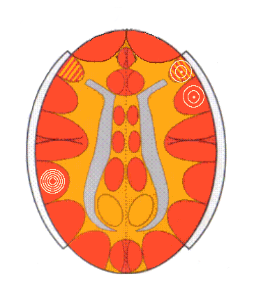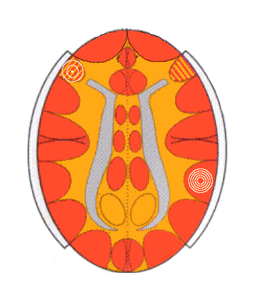 Asma laringeo: Costellazione schizofrenica quando c'è simultaneamente un conflitto nel relè dei muscoli laringei a sinistra ed un conflitto in un relè territoriale nella corteccia destra (vedi figure sottostanti).