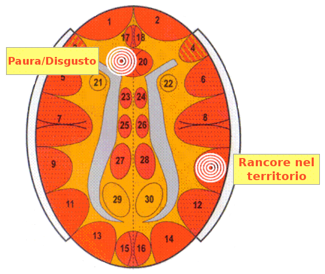 - nella donna destrimane: conflitto di paura con ribrezzo + conflitto di rancore nel territorio