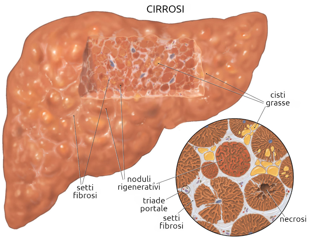 Tratto da MERCK ManualLa cirrosi epatica è uno stadio avanzato della fibrosi epatica che ha provocato una diffusa distorsione della normale architettura epatica. La cirrosi è caratterizzata da noduli rigenerativi circondati da denso tessuto fibrotico. I sintomi possono non svilupparsi per anni e sono spesso aspecifici (p. es., anoressia, affaticamento, perdita di peso). Le manifestazioni tardive comprendono l'ipertensione portale, l'ascite, l'encefalopatia epatica e, quando si verifica lo scompenso, l'insufficienza epatica.