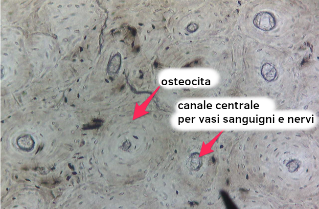 - Osso: tessuto connettivo più forte con poca sostanza fondamentale, matrice dura di calcio e fosforo e cellule ossee specializzate chiamate osteociti