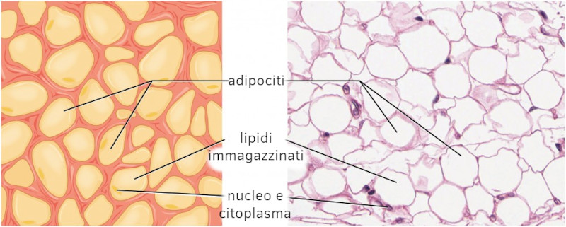 Il tessuto adiposo consiste principalmente di accumulatori adiposi, chiamati adipociti che raccolgono i lipidi in forma di goccioline che riempiono la maggior parte del citoplasma (vedi figura 1). Un gran numero di capillari consente una rapida conservazione e mobilizzazione delle molecole lipidiche. Il grasso contribuisce principalmente all'immagazzinamento dei lipidi, può fungere da isolamento dalle basse temperature e dalle lesioni meccaniche e può proteggere gli organi interni come i reni e gli occhi.
