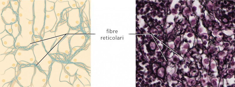 - Formata dalle stesse subunità proteiche delle fibre di collagene; tuttavia, queste fibre rimangono strette e sono disposte in una rete ramificata. Si trovano in tutto il corpo, ma sono più abbondanti nel tessuto reticolare degli organi molli, come fegato e milza, dove si ancorano e forniscono supporto strutturale al parenchima (cellule funzionali, vasi sanguigni e nervi dell'organo).