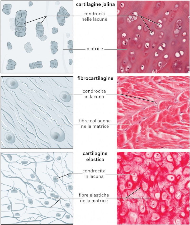 I tre principali tipi di tessuto cartilagineo sono cartilagine ialina, fibrocartilagine e cartilagine elastica.