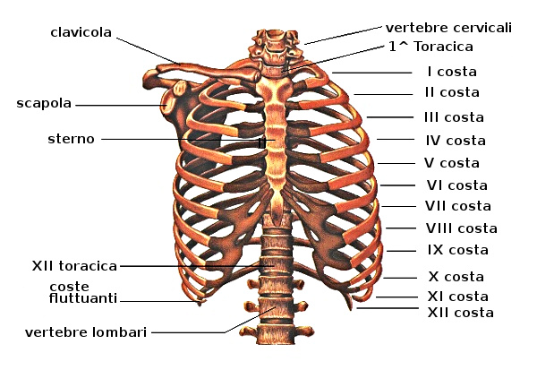 Le costole sono le ossa, 12 per ogni lato, che racchiudono la cavità toracica. Le sette superiori sono connesse direttamente con lo sterno e sono dette costole vere. Le 5 inferiori non sono collegate direttamente allo sterno e sono dette costole false. Di quelle inferiori, dalla ottava alla 10 sono connesse allo sterno attraverso una cartilagine comune, mentre la 11^ e la 12^ sono dette costole fluttuanti. Ogni costola ha una testa che si articola con il corpo vertebrale delle vertebre toraciche. Il corpo costale ha un andamento ricurvo e una sezione lenticolare. Sui bordi superiore e inferiore si inseriscono i muscoli intercostali e sotto il bordo inferiore di ogni costola, scorrono i vasi e i nervi intercostali.