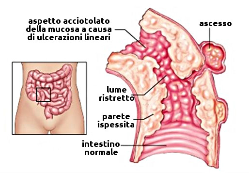 La malattia di Crohn inizia con l'infiammazione delle cripte e la formazione di ascessi, che progrediscono in minuscole ulcere aftoidali focali. Queste lesioni della mucosa possono svilupparsi in profonde ulcere longitudinali e trasversali con edema della mucosa interposta, creando un caratteristico aspetto a ciottoli dell'intestino.