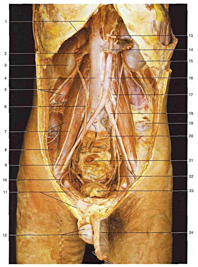 1.Arco costale; 2.vena renale dx; 3.rene dx; 4.vena cava inf; 5.nervo addominogenitale - muscolo quadrato dei lombi; 6.uretere; 7.muscolo psoas maggior e nervo genito-crurale; 8.muscolo iliaco; 9.arteria iliaca esterna; 10.uretere; 11.dotto deferente; 12.testicolo; 13.tronco celiaco; 14.arteria mesenterica superiore; 15.rene sinistro; 16.aorta addominale; 17.arteria mesenterica inferiore; 18.arteria iliaca comune; 19.cresta iliaca; 20.promontorio; 21.retto; 22.arteria spermatica; 23.vescica urinaria; 24.pene