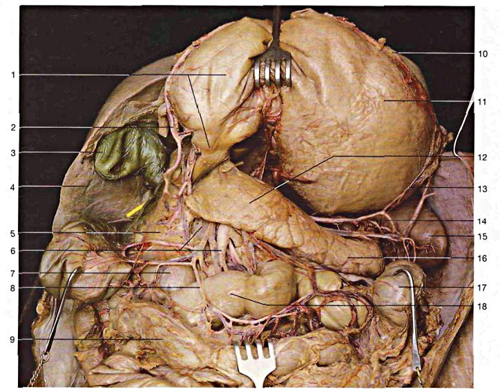 1.stomaco; 2.arteria gastroepiploica dx; 3.fondo della colecisti; 4.fegato; 5.testa del pancreas; 6.arteria e vena mesenterica superiore; 7.duodeno; 8.arteria colica media; 9.colon trasverso; 10.grande curva gastrica; 11.corpo gastrico; 12.corpo del pancreas; 13.arteria gastroepiploica sinistra; 14.arteria splenica; 15.milza; 16.coda del pancreas; 17.flessura colica sinistra; 18.digiuno; - Milza: La Milza è un organo di origine mesodermica, che viene chiamata in causa da conflitto di svalutazione per il non riuscire a lottare, non sentirsi adatti alla lotta ed alla difesa di se'. Nella fase attiva del conflitto avviene una necrosi tissutale silente che, a conflitto risolto viene ripristinata. Questa fase di riparazione determina anche un forte edema ed un ingrossamento della milza che, trazionando sul peritoneo che l'avvolge, manda segnali di dolore. Il dolore pungente alla milza è la CE della fase di riparazione. Il dolore si presenta nella parte alta e sinistra dell'addome.