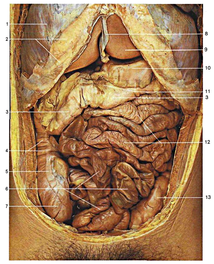 1.diaframma; 2.arco costale; 3.colon trasverso; 4.colon ascendente con austrature; 5.tenia libera; 6.ileo; 7.ceco; 8.legamento falciforme; 9.fegato; 10.stomaco; 11.legamento gastrocolico; 12.digiuno; 13.sigma; 14.appendice; 15.ileo terminale; 16.meso appendicolare; 17.mesentere; - Muscoli e parete: Il dolore addominale relativo alla parete muscolare è più che altro collegato alle ernie, ovvero fuoriuscita di contenuto addominale attraverso canali preformati (canale inguinale, ernia di Spigelio, forame otturatorio, Canale di Scarpa). Se nel sacco erniario si trovano anse intestinali, si può verificare il conflitto del boccone che non procede, che abbiamo già visto. Il dolore è per lo più dato dall'irritazione peritoneale delle anse o dell'omento, specialmente quando ci sia una strozzatura all'orifizio erniario. È un dolore somatico, inizialmente localizzato e poi generalizzato.