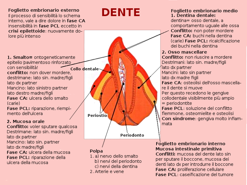 Purtroppo, considerato il meccanismo conflittuale, il non poter mordere (smalto) causa dolore, il che induce la condizione di non riuscire a mordere, con il più che probabile innesco del conflitto mesodermico a carico della dentina e/o dell'osso alveolare. Non solo si ha un coinvolgimento dello smalto, ma si ha un successivo coinvolgimento della dentina e tutto il dente viene distrutto.
