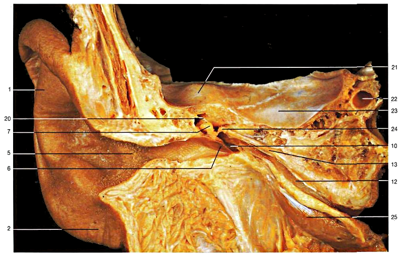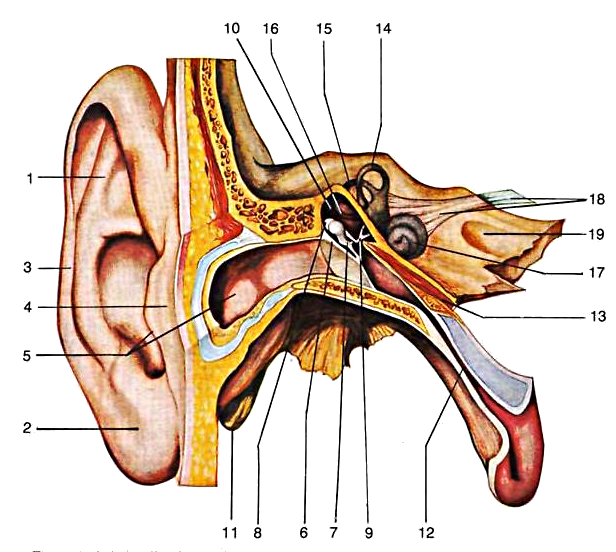 1. Padiglione auricolare; 2. Lobulo dell'orecchio; 3. Elice; 4. Trago; 5. Condotto uditivo esterno; 6. Membrana del timpano; 7. Martello; 8. Incudine; 9. Staffa; 10. Cavità timpanica; 11. Apofisi mastoide; 12. Tromba auditiva o di Euslachio; 13. Muscolo del martello; 14. Condotto semicircolare anteriore; 15. Condotto semicircolare postenore; 16. Condotto semicircolare laterale; 17. Chiocciola; 18. Nervo vestibolococleare (VIII); 19. Porzione petrosa dell'osso temporale; 20. Legamento superiore del martello; 21. Eminenza arcuata; 22. Arteria carotide interna; 23. Faccia anteriore della porzione petrosa; 24. Staffa; 25. Muscolo elevatore del velo palatino