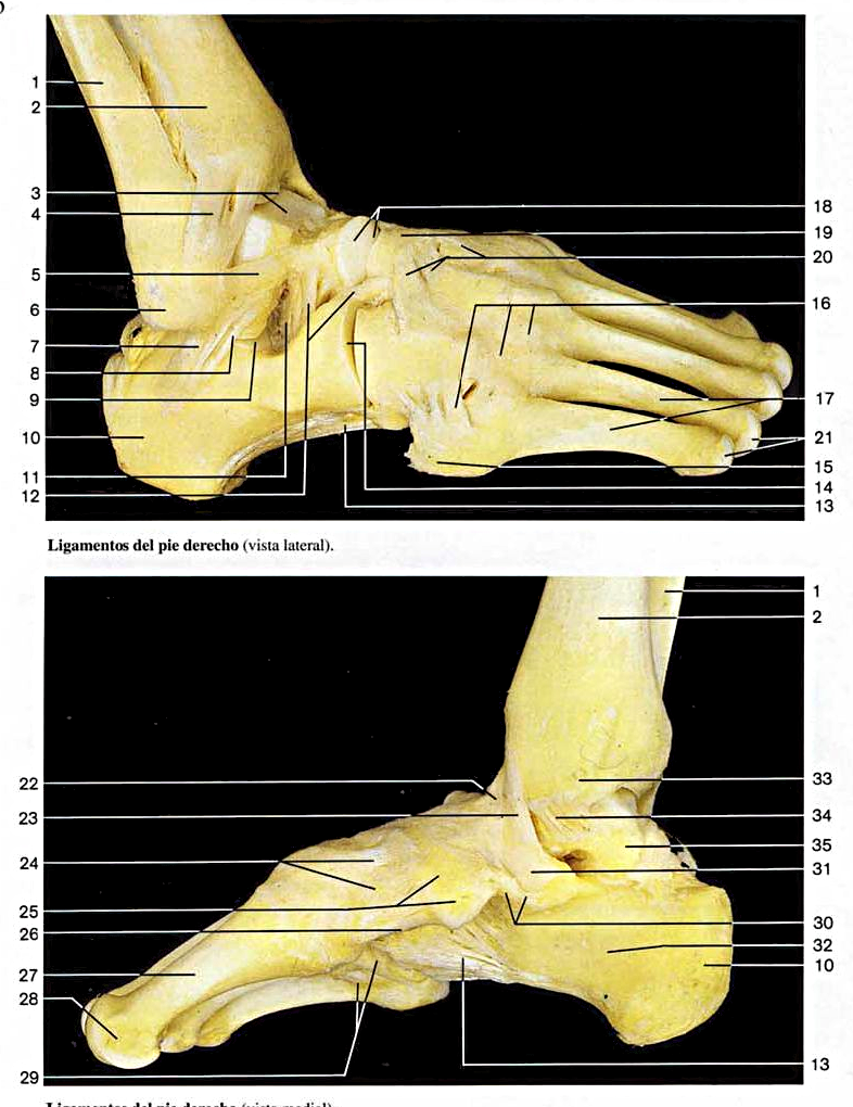 1. Perone; 2. Tibia; 3. Articolazione tibioperoneo-astragalica (talocrurale); 4. Legamento tibioperoneo anteriore, articolazione talocrurale; 5. Legamento peroneoastragalico anteriore; 6. Malleolo laterale (peroneale); 7. Legamento calcaneoperoneo; 8. Legamento calcaneoastragalico laterale; 9. Articolazione astragalocalcaneare; 10. Tuberosità posteriore del calcagno; 11. Legamento calcaneoastragalico interosseo; 12. Legamento biforcato; 13. Gran legamento plantare; 14. Articolazione calcaneocuboidea; 15. Apofisi stiloide del V metatarso; 16. Legamenti tarsometatarsali dorsali; 17. Metatarsi; 18. Testa dell'astragalo. Articolazione astragalocalcaneonavicolare; 19. Osso navicolare; 20. Legamenti cuneonavicolari dorsali; 21. Teste dei metatarsi; 22. Fascicolo tibionavicolare del legamento deltoideo; 23. Fascicolo tibiocalcaneare del legamento deltoideo; 24. Legamenti cuneonavicolari dorsali; 25. Osso navicolare; 26. Legamento cuneonavicolare plantare; 27. Metatarso; 28. Testa del I metatarso; 29. Legamenti tarsometatarsali plantari; 30. Legamenti calcaneonavicolari plantari; 31. Apofisi minore del calcagno; 32. Calcagno; 33. Malleolo mediale (tibiale); 34. Fascicolo tibioastragalico posteriore del legamento deltoideo; 35. Astragalo.