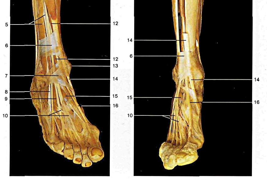 5. M. estensore lungo delle dita; 6. Porzione superiore del legamento anulare anteriore del tarso (retinacolo superiore dei Muscoli tensori); 7. Porzione inferiore del legamento anulare anteriore del tarso; 8. Tendine del Muscolo peroneo anteriore; 9.Muscolo estensore corto delle dita; 10. Tendini del Muscolo estensore lungo delle dita; 12. Muscolo estensore dell'alluce; 13. Malleolo mediale (tibiale); 14. Tendine del Muscolo tibiale anteriore; 15. Muscolo estensore corto dell'alluce; 16. Tendine del Muscolo estensore dell'alluce.