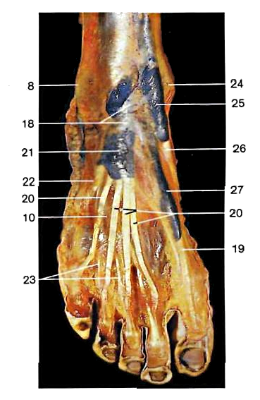 8. Malleolo laterale; 10. Muscolo estensore corto delle dita; 18. Porzione inferiore del legamento anulare anteriore del tarso; 19. Tendine del Muscolo estensore lungo dell'alluce; 20. Tendini del Muscolo estensore lungo delle dita; 21. Guaina tendinea del muscolo estensore lungo delle dita; 22. Tendine del muscolo peroneo anteriore per il bordo laterale del piede; 23. Tendini del muscolo estensore corto delle dita; 24. Malleolo mediale (tibiale); 25. Guaina tendinea del muscolo tibiale anteriore; 26. Tendine del muscolo tibiale anteriore; 27. Guaina tendinea dell'estensore lungo del primo dito.