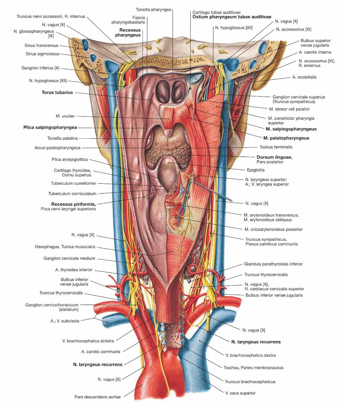 Altro nome di gola. Si tratta di una cavità irregolare in cui si aprono le cavità orale e nasale sopra e dove la laringe e l'esofago si aprono al di sotto. La faringe mette in comunicazione le vie aeree e le vie digestive. Nella parte superiore sboccano le Trome di Eustachio che sono in contatto con l'orecchio medio e tra i due orifizi si trovano delle ghiandole linfatiche dette Adenoidi.
