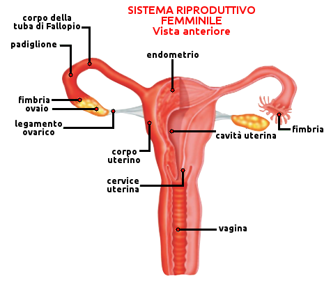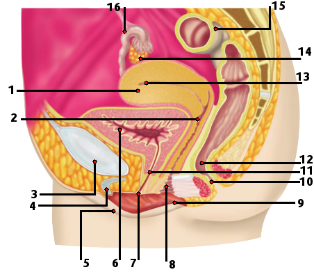 1.Miometrio; 2.Vagina; 3.Osso pubico; 4.Clitoride; 5.Grande labbro; 6.Vescica; 7.Meato uretrale; 8.Meato vaginale; 9.Piccolo labbro; 10.Ano; 11.Uretra; 12.Retto; 13.Utero; 14.Ovaio; 15.Colon; 16.Tuba di Fallopio