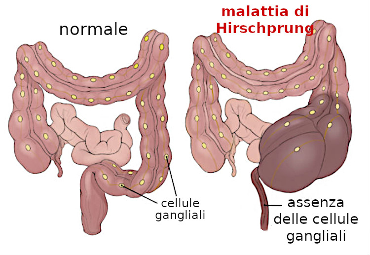 Tratto da Wikipedia ingleseLa malattia di Hirschsprung è un disturbo presente già alla nascita per cui l'innervazione dell'intestino manca di alcune componenti. Il sintomo più importante è la stitichezza. Altri sintomi possono includere vomito, dolore addominale, diarrea e lento accrescimento. I sintomi di solito diventano evidenti nei primi due mesi di vita.