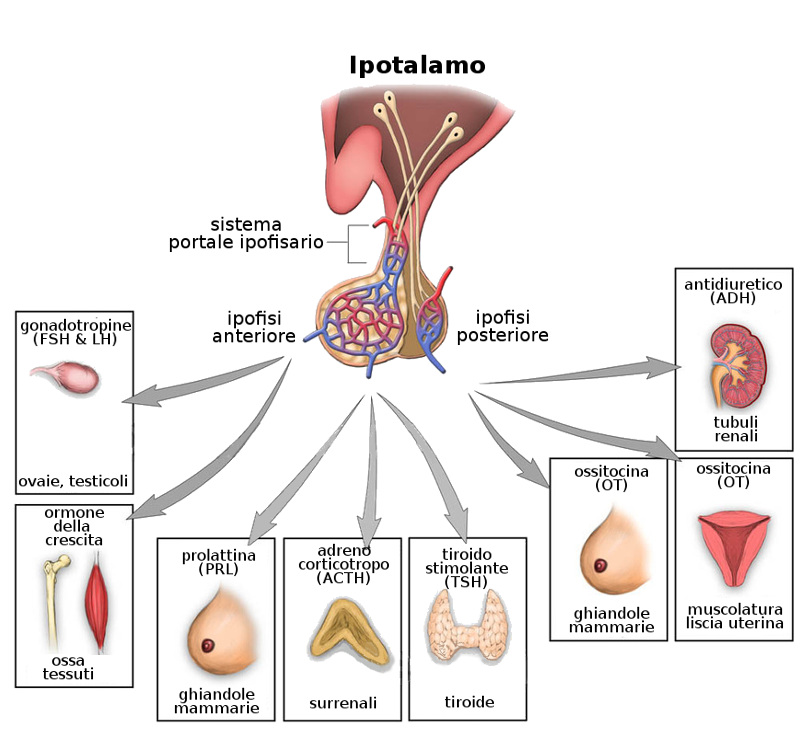 - Ipofisi posteriore: Ha a che fare con l'ormone antidiuretico (vasopressina), regola i fluidi nell'organismo e l'ossitocina, che favorisce il travaglio di parto.