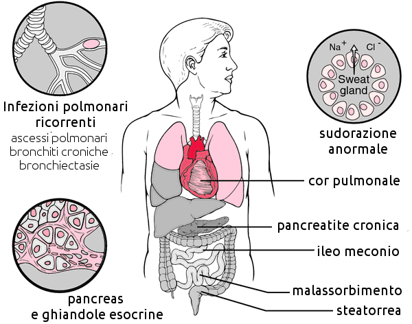 Secondo la MUMedicina Ufficiale la fibrosi cistica, o mucoviscidosi, o malattia fibrocistica del pancreas, è una malattia genetica autosomica recessiva che si manifesta pienamente soltanto negli omozigoti e ha una leggera sintomatologia clinica negli eterozigoti (questi presentano un bilancio ionico funzionale, ma espellono più difficilmente acqua dalle cellule). La patologia è causata da una mutazione del gene CFTCR (Cystic Fibrosis Transmembrane Conductance Regulator). La patologia è caratterizzato dalla difficoltà a prendere peso nonostante il buon appetito, dai ripetuti attacchi di bronchite (con bronchiectasiaAllargamento del lume bronchiale per sfiancamento delle pareti sviluppata in giovane età) e dalle feci molli e maleodoranti.
