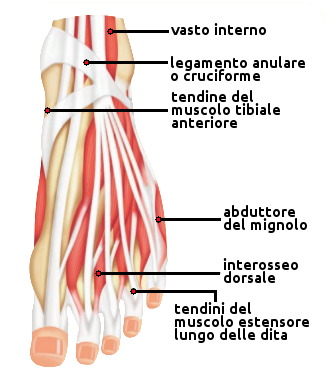 I tendini assomigliano a corde inestensibili; sono di colore bianco e sono formati da fibre di collagene ad alta resistenza. Per mezzo di essi i muscoli si inseriscono nell'osso. Quando il muscolo si contrae, tira l'osso attraverso i tendini. Il tendine più grande del nostro corpo è il tendine d'Achille che origina dal muscolo gastrocnemio del polpaccio e si inserisce sul calcagno. Permette di alzarsi sulle punte dei piedi.