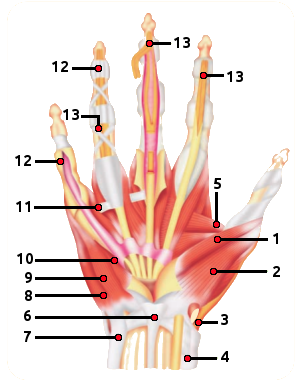 1. M. flessore breve del pollice; 2. M. abduttore breve del pollice; 3. Guaina tendinosa del m. abduttore; 4. Legamento anulare del carpo; 5. M. abduttore del pollice; 6. Tendine del m. palmare gracile; 7. Tendine del m. cubitale anteriore; 8. M. abduttore del mignolo; 9. M. flessore breve del mignolo; 10. M. opponente del mignolo; 11. Legamento metacarpale; 12. Guaina fibrosa; 13. Tendine - I muscoli dell'addome avvolgono e proteggono le viscere addominali. Rendono possibile il meccanismo di evacuazione e facilitano alcuni movimenti della colonna vertebrale.