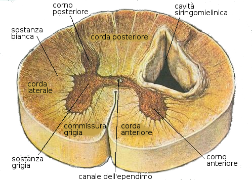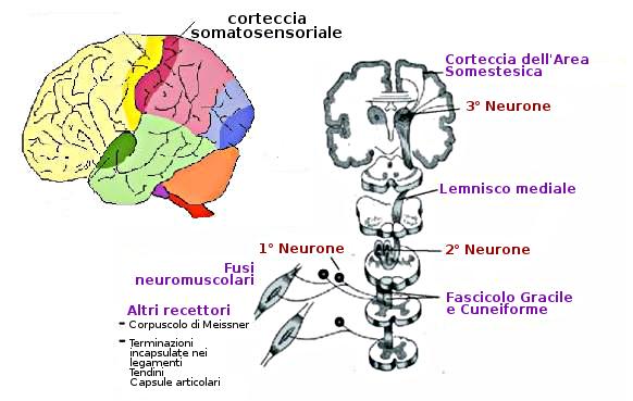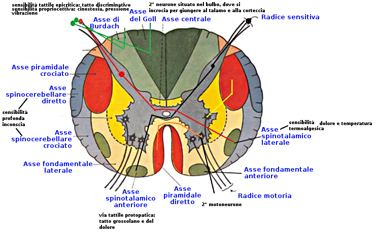 Gli stimoli che danno luogo alla sensibilità tattile, vibratoria, di pressione e posizione articolare transitano da fibre mieliniche grosse. Gli stimoli percepiti come dolore o cambi di temperatura passano da fibre amieliniche o mieliniche fini.