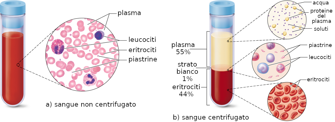 Il sangue è composto per il 55% di una sostanza liquida: il plasma; e per il 45 % da elementi cellulari.