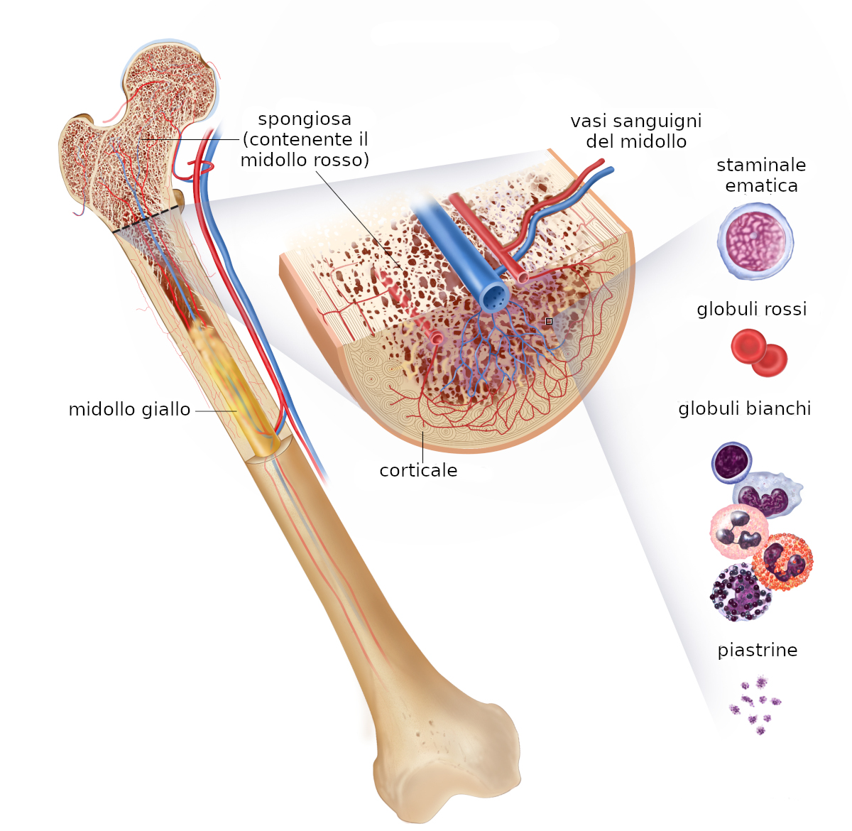 - la linea mieloide da cui si sviluppa la mielopoiesi, processo che porta alla produzione di granulociti, monociti, megacariociti-piastrine, globuli rossi maturi.
