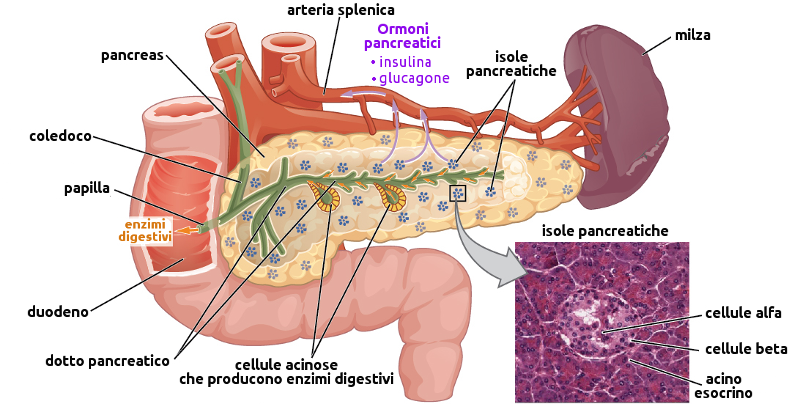 Il pancreas è una ghiandola sia endocrina sia esocrina. La parte endocrina del pancreas è costituita soprattutto da due differenti tipi di cellule, dette cellule alfa e cellule beta, riunite in isole completamente circondate dalla parte esocrina; le isole di Langerhans producono insulina e glucagone, due ormoni coinvolti nella regolazione del metabolismo del glucosio.