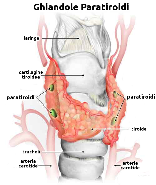 Le quattro ghiandole paratiroidi sono le ghiandole endocrine più piccole oggi conosciute (pochi millimetri di diametro) e sono inserite nel tessuto della tiroide. Esse producono l'ormone paratiroideo (PTH), detto anche paratormone, che agisce in contrapposizione alla calcitonina in quanto aumenta in vari modi la concentrazione degli ioni calcio nel sangue; per esempio, stimola il tessuto osseo a liberare il calcio nella corrente sanguigna e favorisce l'assorbimento degli ioni calcio dall'intestino.