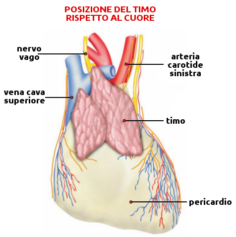- il timo è un organo bilobulato, situato nel mediastino anteriore, sopra il pericardio. Il parenchima timico è formato da una maglia di cellule epiteliali, ripiene di cellule linfoidi in sviluppo (timociti) e si organizza in lobuli, in ognuno dei quali c'è una zona esterna o corteccia, dove c'è la maggior parte dei timociti, e una zona interna o midollare con scarsi timociti. Il volume del timo aumenta durante la vita fetale e postnatale fino alla pubertà, momento nel quale inizia ad involvere.