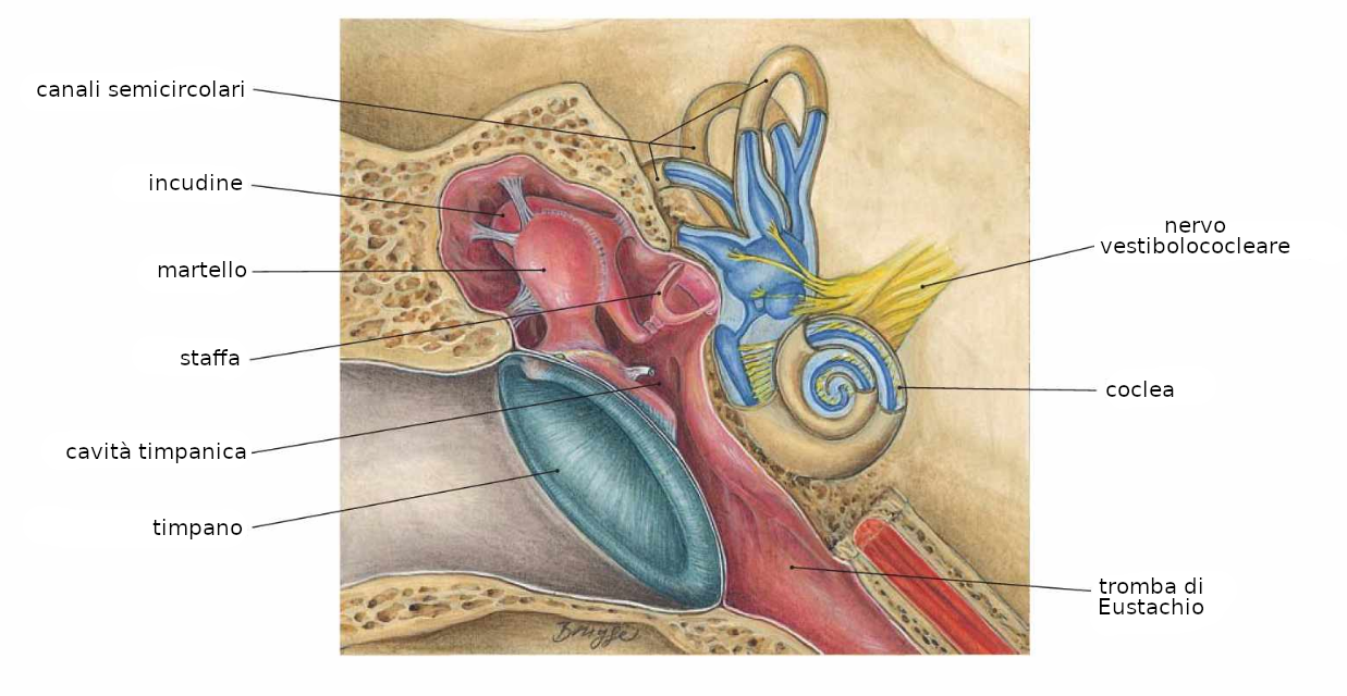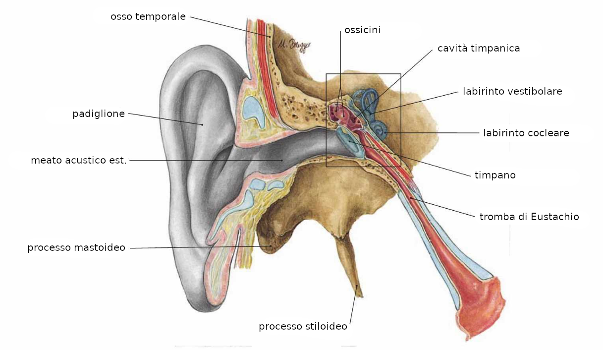 orecchio esterno, orecchio medio e orecchio interno.