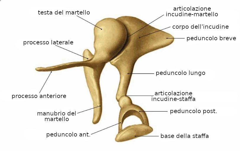 All'interno dell'orecchio medio ci sono tre ossicini, chiamati martello, incudine e staffa; trasmettono le vibrazioni dal timpano verso l'orecchio interno. Vale a dire che nell'orecchio medio, la trasmissione dei suoni avviene tramite un mezzo solido.