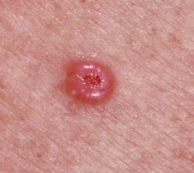 Più comunemente il carcinoma inizia con una papula lucida, che si allarga lentamente e dopo mesi o anni mostra dei bordi prominenti con telangectasie ai bordi ed una ulcerazione al centro. La formazione di croste ricorrenti e il sanguinamento non sono inusuali. Comunemente i carcinomi sembrano guarire, causando una sottostima della lesione da parte della persona e del medico.