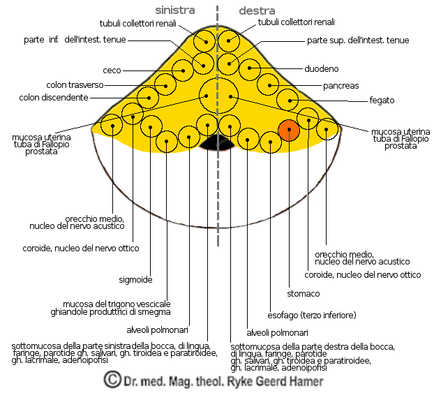 - [7]: il cancro dello stomaco è insidioso in quanto la persona ha un grave conflitto che coinvolge il viscere deputato alla prima digestione ed all'immagazzinamento del cibo. Se il conflitto dura a lungo, il dispendio energetico della fase simpaticotonica giunge a tale livello, da non consentire alla persona di superare la importante e seria fase di riparazione vagotonica. Se l'organo viene parzialmente asportato chirurgicamente, ma la persona non ha risolto il suo conflitto, il relè cerebrale continua a stimolare la parte rimasta (recidive locali).