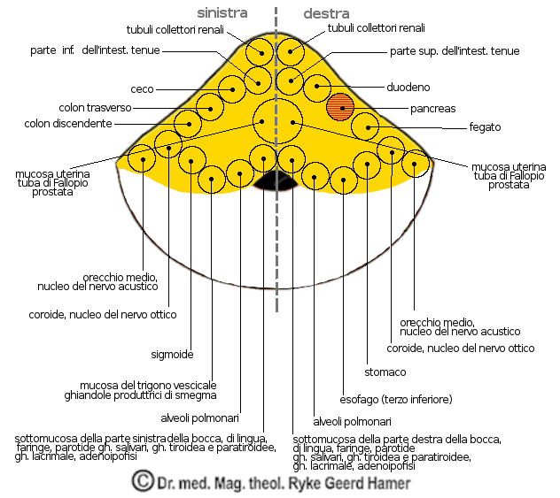 Il cancro del pancreas interessa le strutture ghiandolari dell'organo, che sono tessuto endodermico e rispondono quindi ai conflitti legati al boccone.