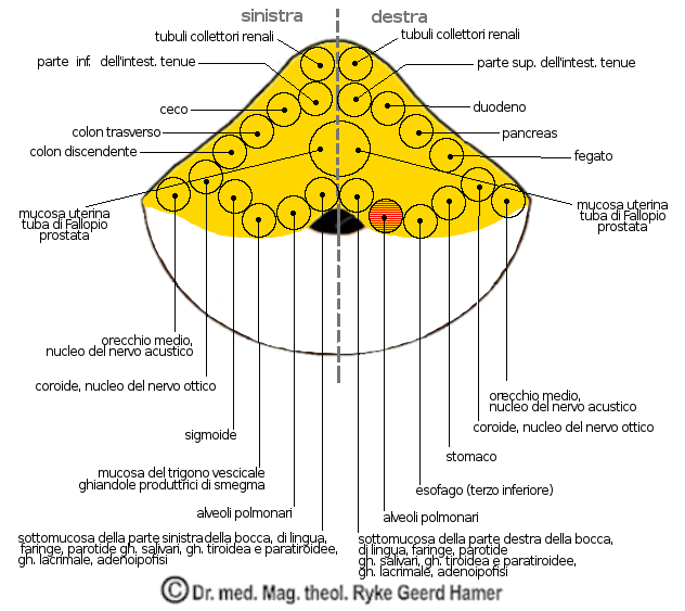 Gli alveoli corrispondo allo stato conflittuale della sopravvivenza, paura di morire. I bronchi hanno a che fare con lo stadio conflittuale delle relazioni, minaccia del territorio. In caso di un cancro è necessario considerarli entrambi. Va tenuto in conto il sentito di tristezza e non va dimenticato il conflitto programmante legato al giro di cordone ombelicale intorno al collo.