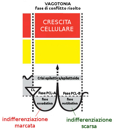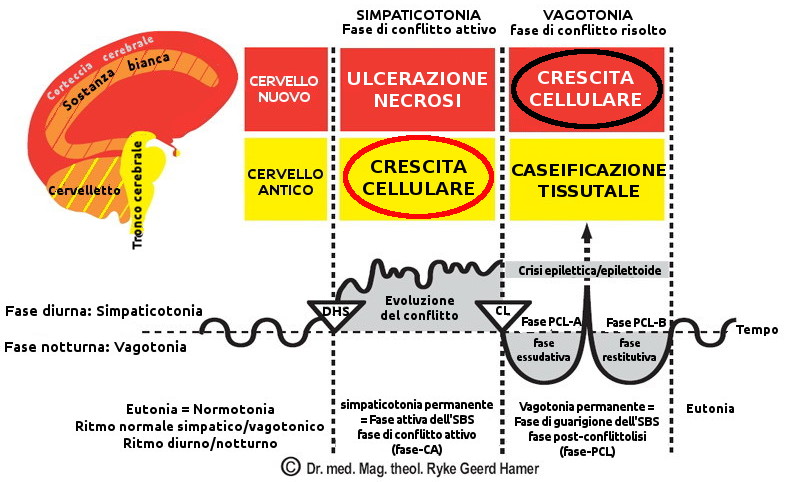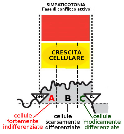 Nei tessuti arcaici (endoderma e mesoderma antico), la crescita avviene durante la fase attiva del conflitto (simpaticotonia). Nei tessuti ontologicamente più recenti, la crescita tissutale avviene nella fase di riparazione (vagotonia).