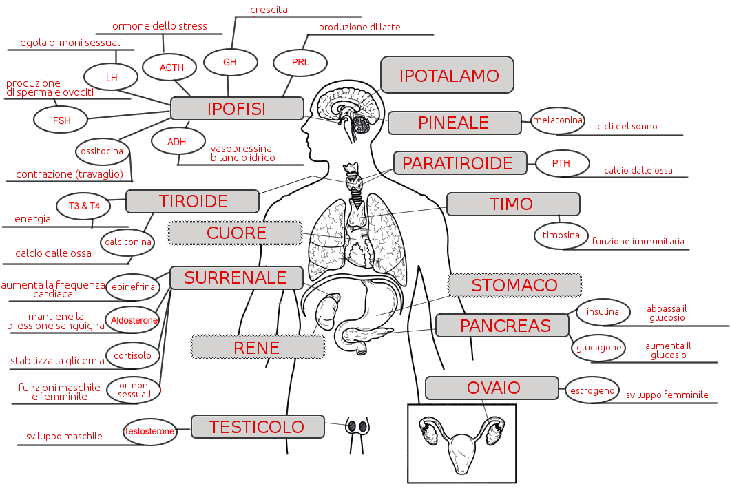Il sistema endocrino è costituito da diverse ghiandole sparse nell'organismo; tali ghiandole producono ormoni, molecole segnale che, trasportate dal sistema circolatorio in tutto il corpo, producono effetti su specifici organi o tessuti bersaglio.